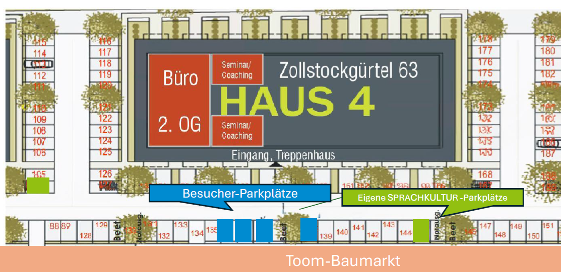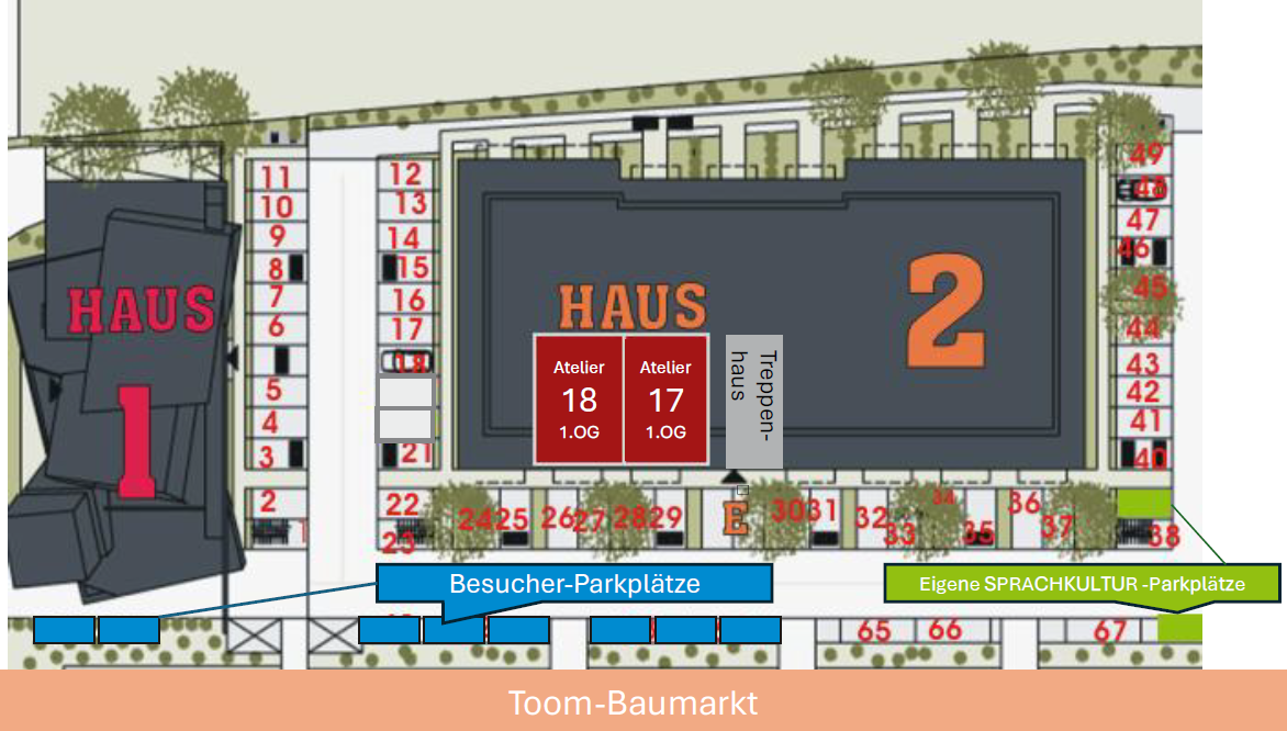 Wir haben eigene SPRACHKULTUR Stellplätze, sowie mehrere Besucher-Stellplätze auf dem gesamten Gelände. Bitte parken Sie nur auf den genannten Flächen markiert mit „BESUCHER“ oder „SPRACHKULTUR“.
